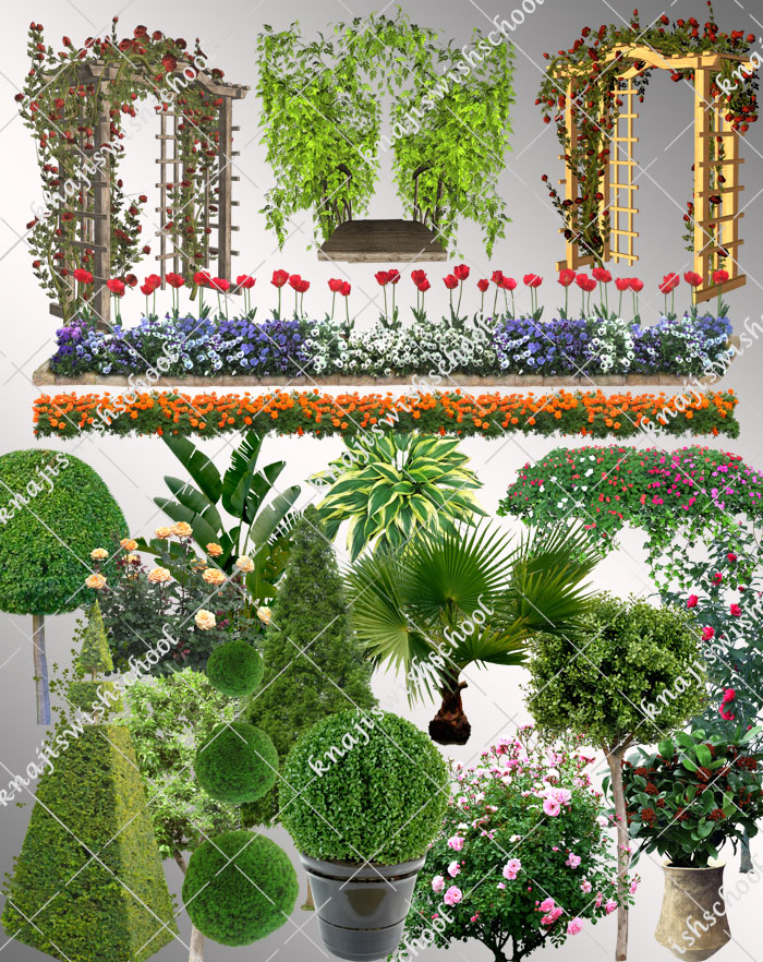 مجموعه رائعه من اشجار ونباتات وزهور وسقالة خشب للحدائق دون خلفيه.j... |
